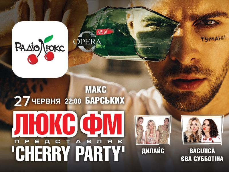 Приходьте усі на нашу стильну, модну, молодіжну "Cherry party". Для вас буде виступати сам Макс Барських, а ми усі знаємо, що його концерти завжди перетворюються у яскраві шоу. Також на сцені неперевершені красуні Ділайс.
