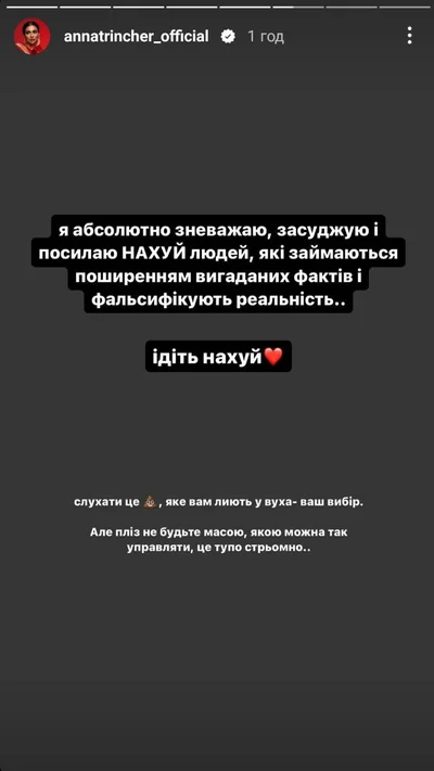 Я абсолютно зневажаю, засуджую і посилаю на**й людей, які займаються поширенням вигаданих фактів і фальсифікують реальність. Слухати гімно, яке вам ллють у ваші вуха — ваш вибір. Але пліз, не будьте масою, якою можна так легко управляти.
