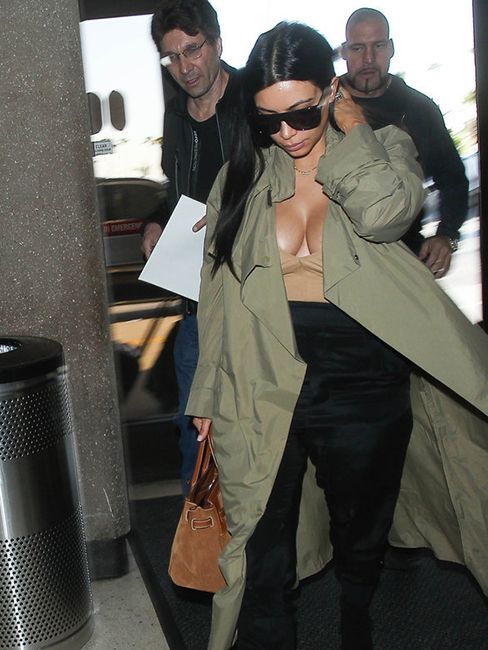 Ким Кардашьян выглядела модно: на ней красовались высокие черные штаны и плащ цвета хаки.