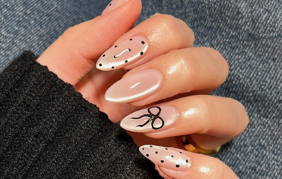 Ще одна інтерпретація — дрібний горошок у поєднанні з делікатними бантиками. Сяюча нюдова основа виглядає витончено сама по собі, а чорні крапки додають графічності. Бантик краще залишити на одному нігті, щоб дизайн не виглядав перевантаженим. Один ніготь можна взагалі залишити без малюнка — так манікюр збереже легкість. У підсумку виходить ніжний, але виразний варіант.