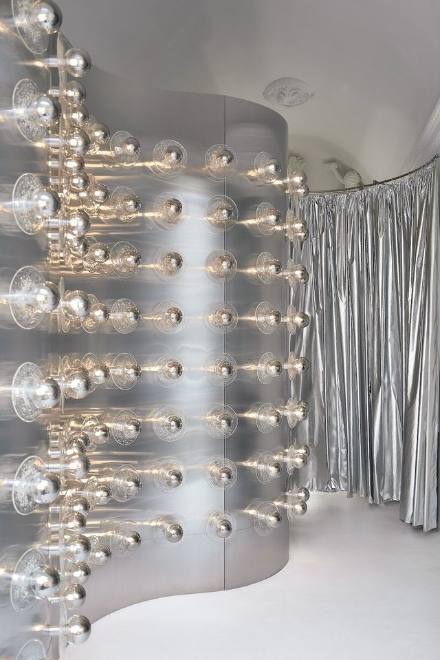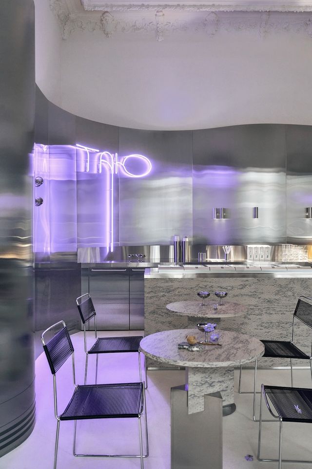 Дизайн інтер’єру розробила українська студія Sivak+Partners — історичну стелю з ліпниною поєднали з суцільною металевою хвилею уздовж стін.