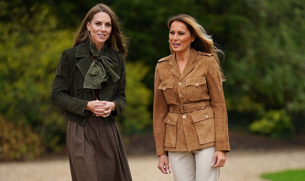 В останній день державного візиту президента Трампа Кейт та перша леді США Меланія Трамп відвідали сади Фрогмор у Віндзорському замку. Вона тепло закуталася у довгу коричневу спідницю міді та жилет, а також зелений шарф та укорочений піджак у тон.