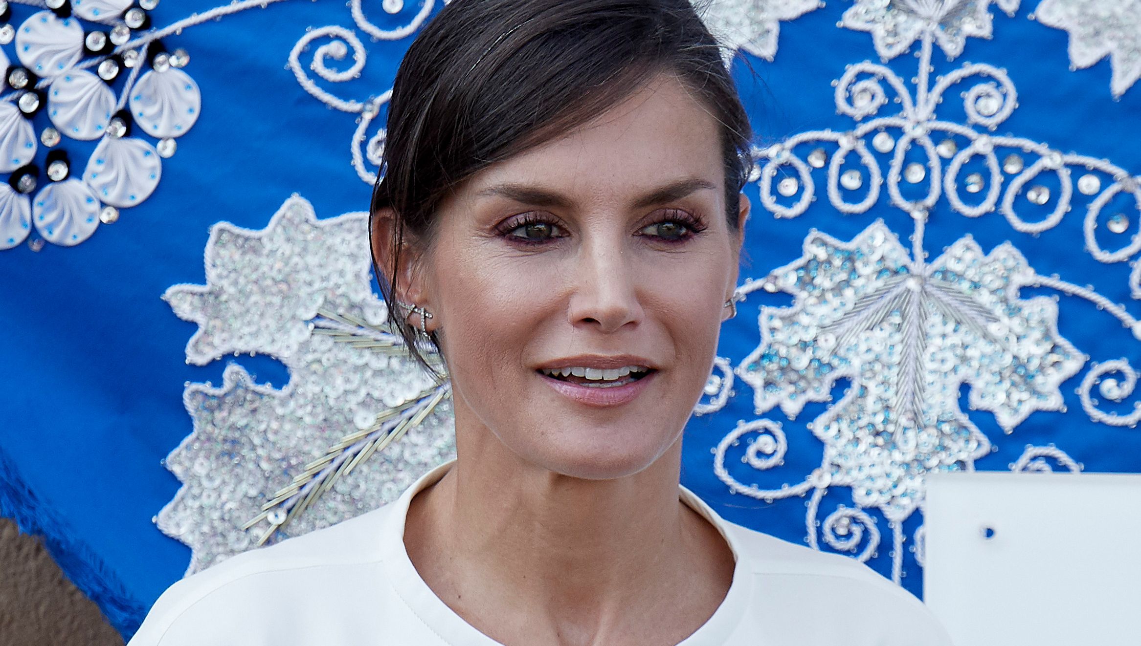 Монарх прийняла участь у відкритті стипендіального курсу в шкільних центрах «Баталья де Павія» і «Віа Далмація» в Торрехонсільйо. Для виходу вона обрала білий топ-оверсайз з короткими рукавами, який доповнила темно-синіми штанами з високою талією й складками в поясі.