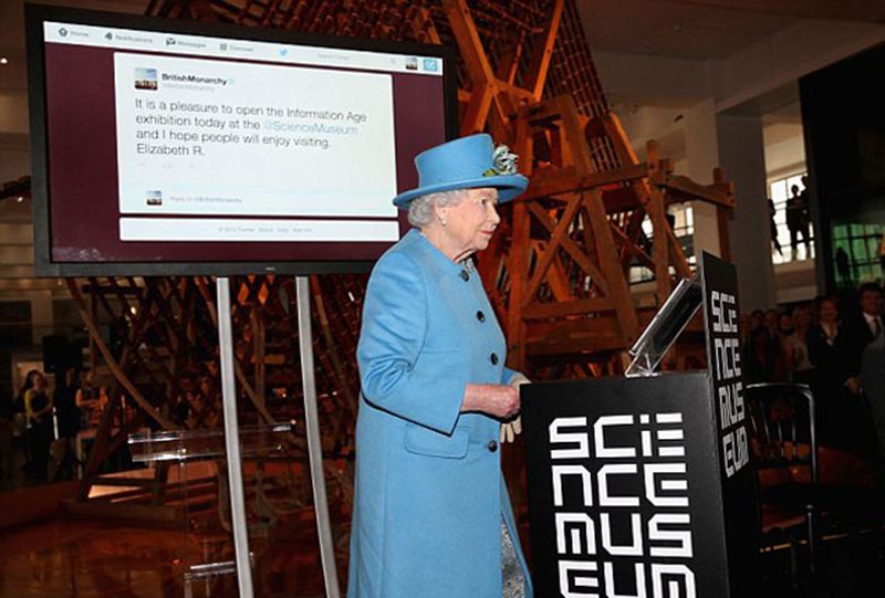 Первая запись в социальной сети, сделанная королевой, появилась 24 октября. «Я с удовольствием открыла выставку «Информационный век» сегодня в Музее науки. Надеюсь, люди будут рады ее посетить», - гласил первый твит Елизаветы ІІ.