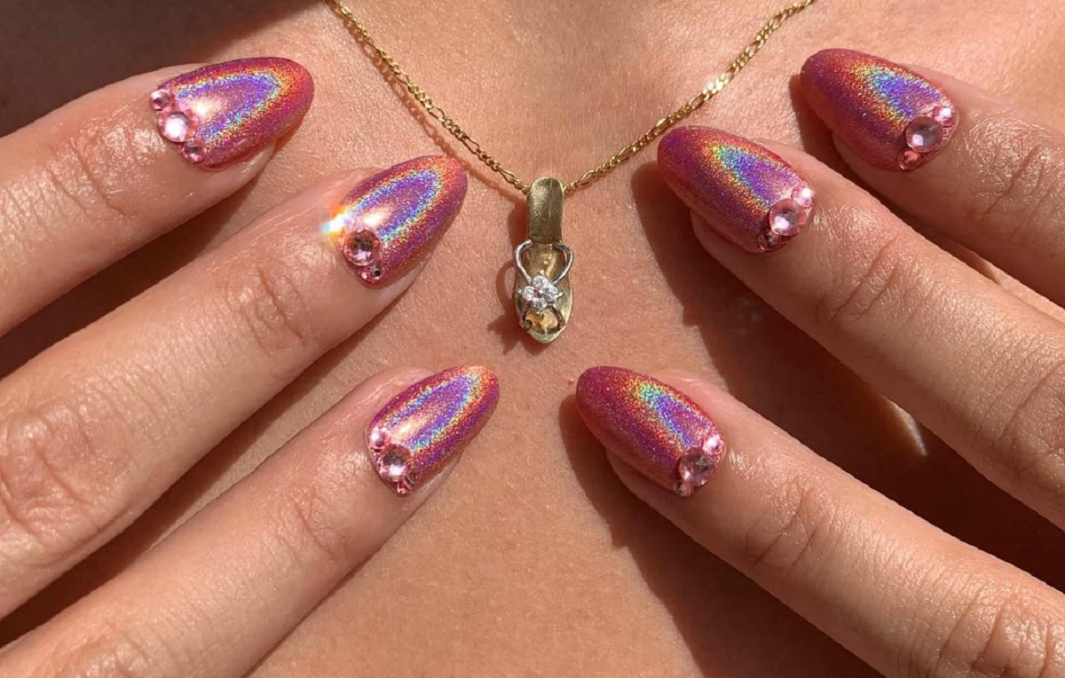 Голографія — це завжди вау-ефект. Переливи світла створюють відчуття розкоші, а стрази біля кутикули додають акценту. Яскравий рожевий із голографічним фінішем і камінчики в тон виглядають сміливо та святково. Такий манікюр точно не залишиться непоміченим.