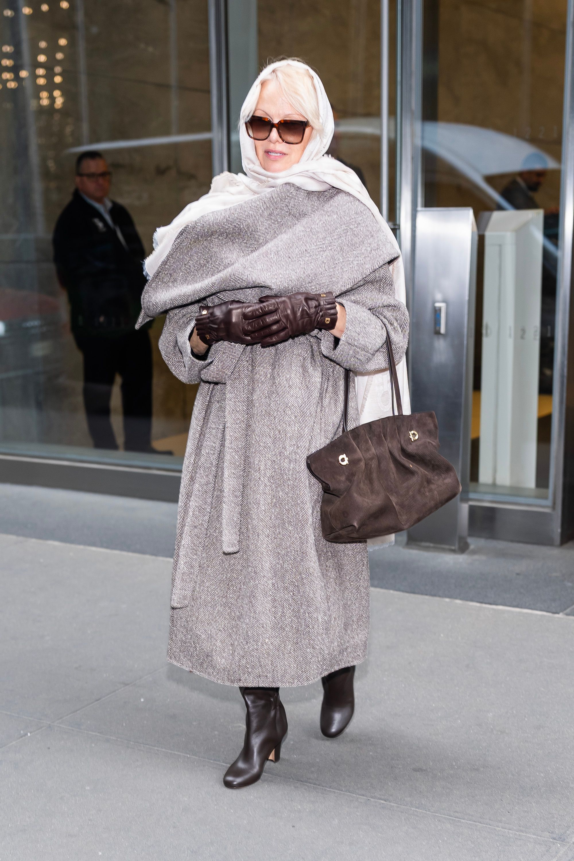 Памела поєднала свій образ із парою великих сонцезахисних окулярів та шовковою хусткою в старовинному стилі, створивши привабливий образ, що нагадує про голлівудський гламур минулих часів, але водночас пропонує сучасне оновлення з тонкою відсиланням на ключові модні колірні тренди 2026 року завдяки елегантному поєднанню вовняного капучино та шоколадно-коричневих відтінків.