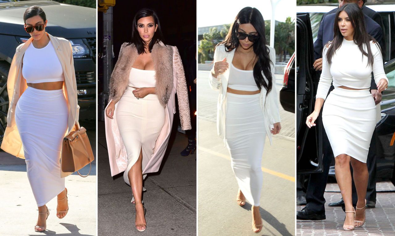 Ким Кардашьян в белом кроп-топе и белой юбке-карандаш