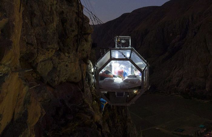 В Перу находится один из самых уникальных отелей в мире. Он находится в горах, на высоте 120 метров. Отель Skylodge Adventure Suites представляет собой стеклянную капсулу. Здесь может поместиться всего 8 человек. Не каждый рискнет поселится в таком отеле. Но зато эмоций хватит на всю жизнь.