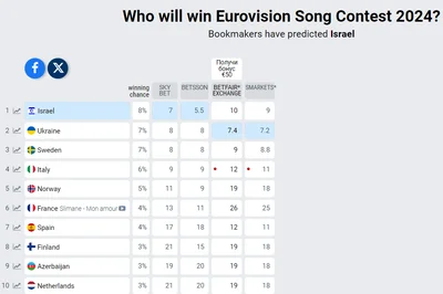 Пока лидирует Израиль, у которого 8% шансов на победу. За ним следуют Украина и Швеция — 7% на выигрыш. У Италии шанс выиграть составляет 6%, а Норвегии — 5%. Замыкают десятку потенциальных лидеров Нидерланды.