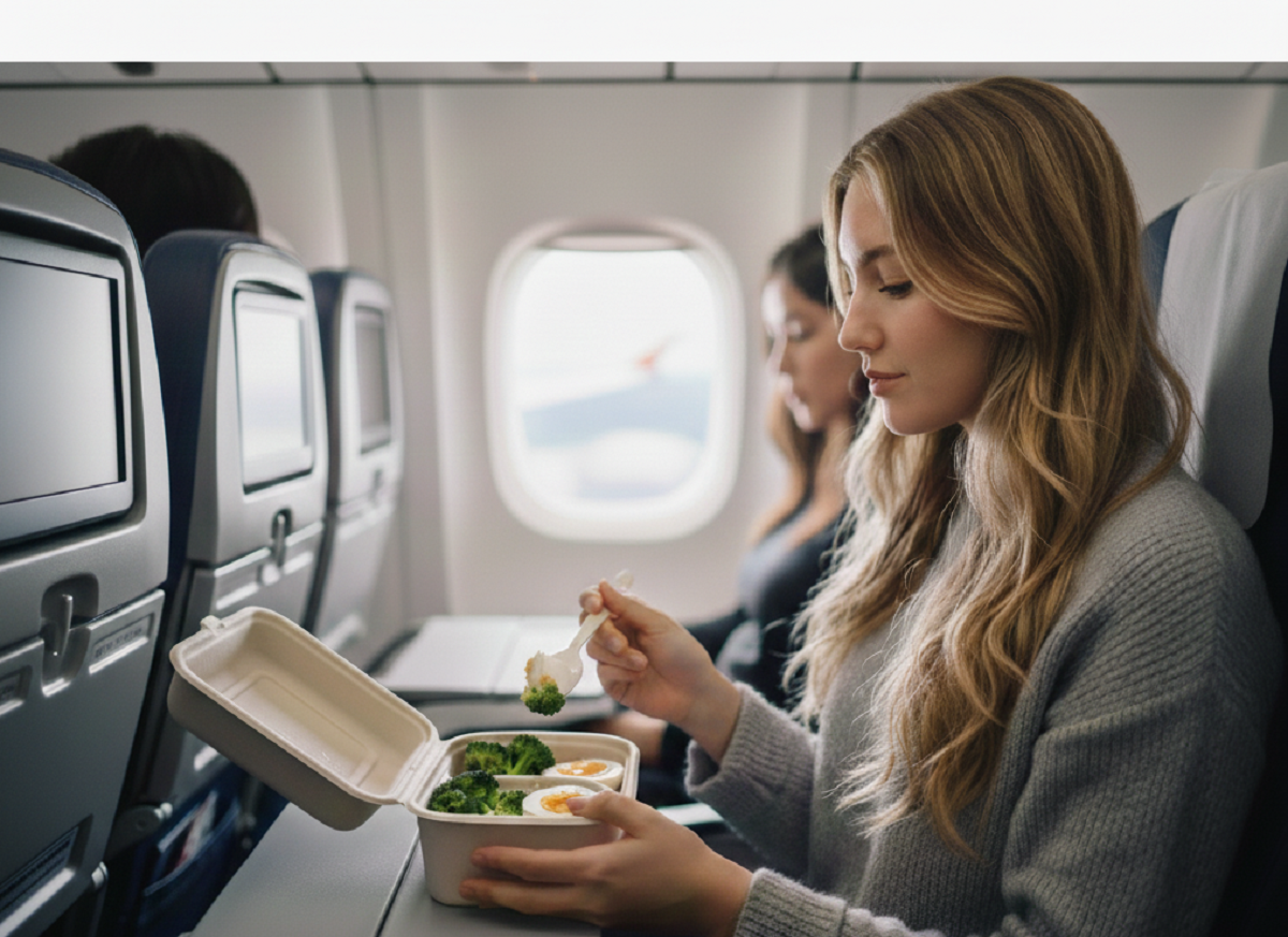 Женщина в самолете ест вареные яйца / Источник: Создан ИИ Gemini