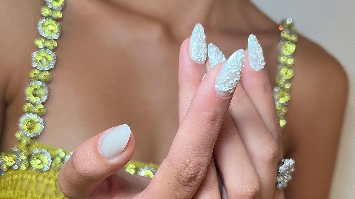 Рельефные и нежные "кружевные ногти" прекрасно сочетаются со всеми элементами гардероба в стиле coquettecore – кокетками, кружевом, вязаной крючком одеждой и милыми балетками (так, они тоже снова в тренде).
