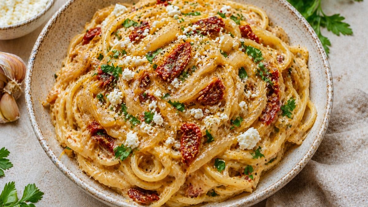 - Добавляем крем-сыр, фету, нарезанные вяленые томаты или сливы, петрушку. Вливаем немного воды из-под макарон (чтобы отрегулировать консистенцию) и добавляем сами макароны.