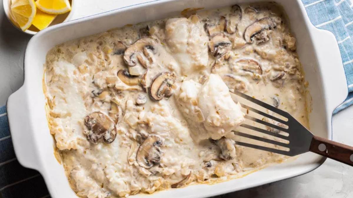 - Выложи куски рыбы в форму для запекания, залей сливочно-грибным соусом и поставь в разогретую до 180°C духовку на 20-25 минут.