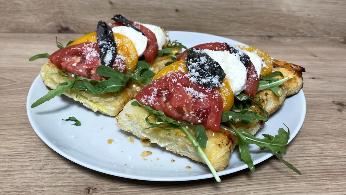 - Вынь слойки из духовки, переверни их. Укрась блюдо свежей рукколой, нарезанными помидорами, моцареллой и листиками базилика. Сверху полей бальзамическим соусом для дополнительного аромата и вкуса. Приятного аппетита!