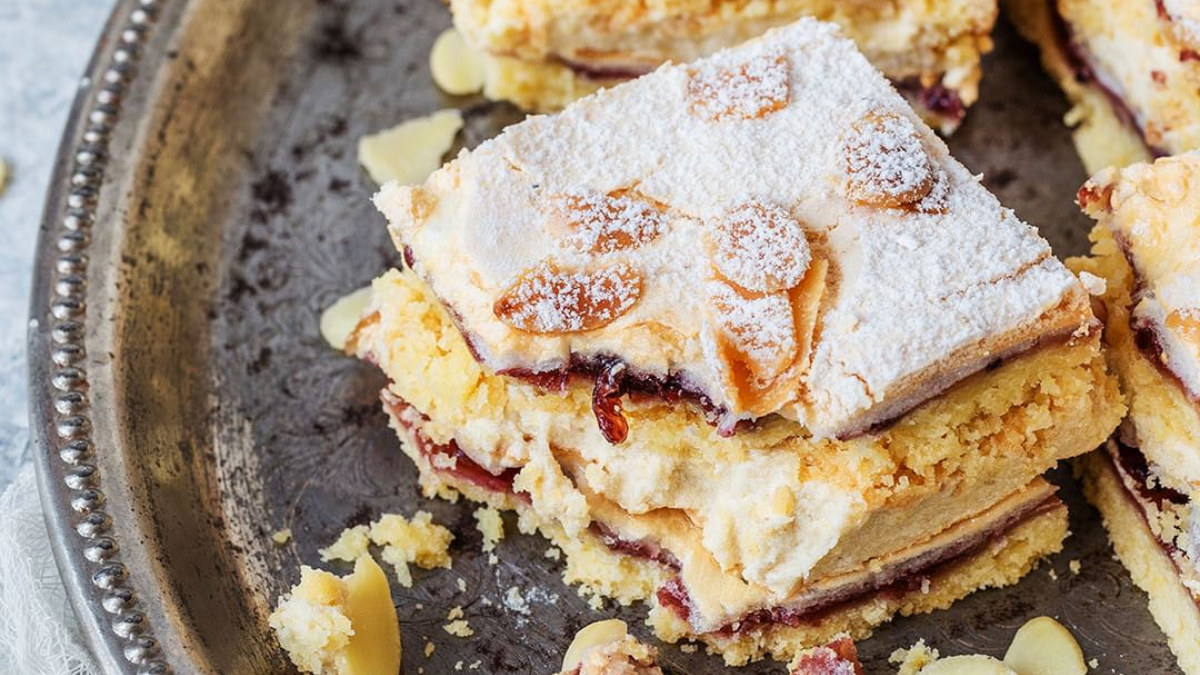 - Затем перемешай тесто, раздели на три части и раскачай в одинаковые лепешки. Противень застели пергаментом, смажь жиром, выложи первый корж, поколи его вилкой и смажь начинкой. Накрой вторым коржом, также поколи вилкой и смажь любым джемом. Накрой третьим коржом, поколи вилкой, смажь белками, посыпь сахаром и орехами.