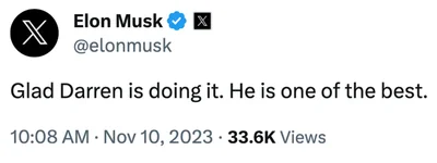 "Рад, что Даррен это делает. Он один из лучших", — написал Маск.