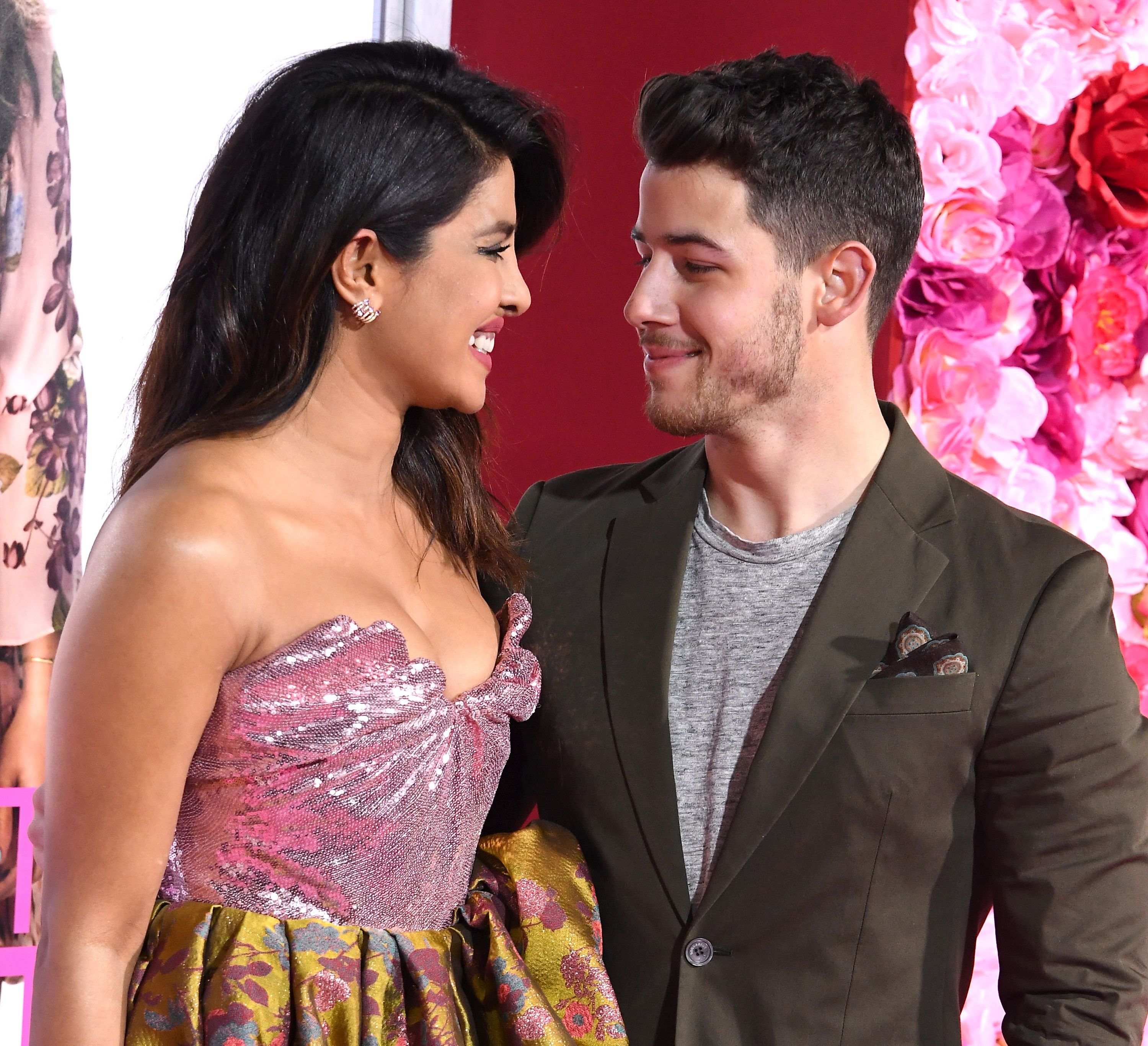 Супруги, которые и не собирались скрывать свои нежные чувства друг к другу, позировали на фоне розовых инсталляций с розами. Для выхода Приянка выбрала платье Vivienne Westwood, таким образом сделав акцент на пышной груди.