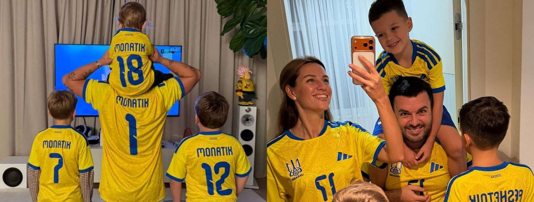 В своих Instagram Джамала, Григорий и Кристина Решетники, Дмитрий и Ирина Монатики показали, как их семейные футбольные команды болели за Сборную. Оф корс, самыми активными и быстрыми были самые молодые – Леон (сын Монатика) и Алим (сын Джамалы).