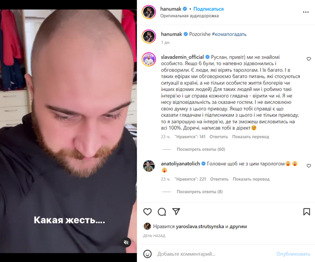 После разборок с экс-женой Алиной Шаманской комик и музыкант Руслан Ханумак взялся за ведущего Славу Демина, а все из-за видео с тарологиней Людмилой Хомутовской.
