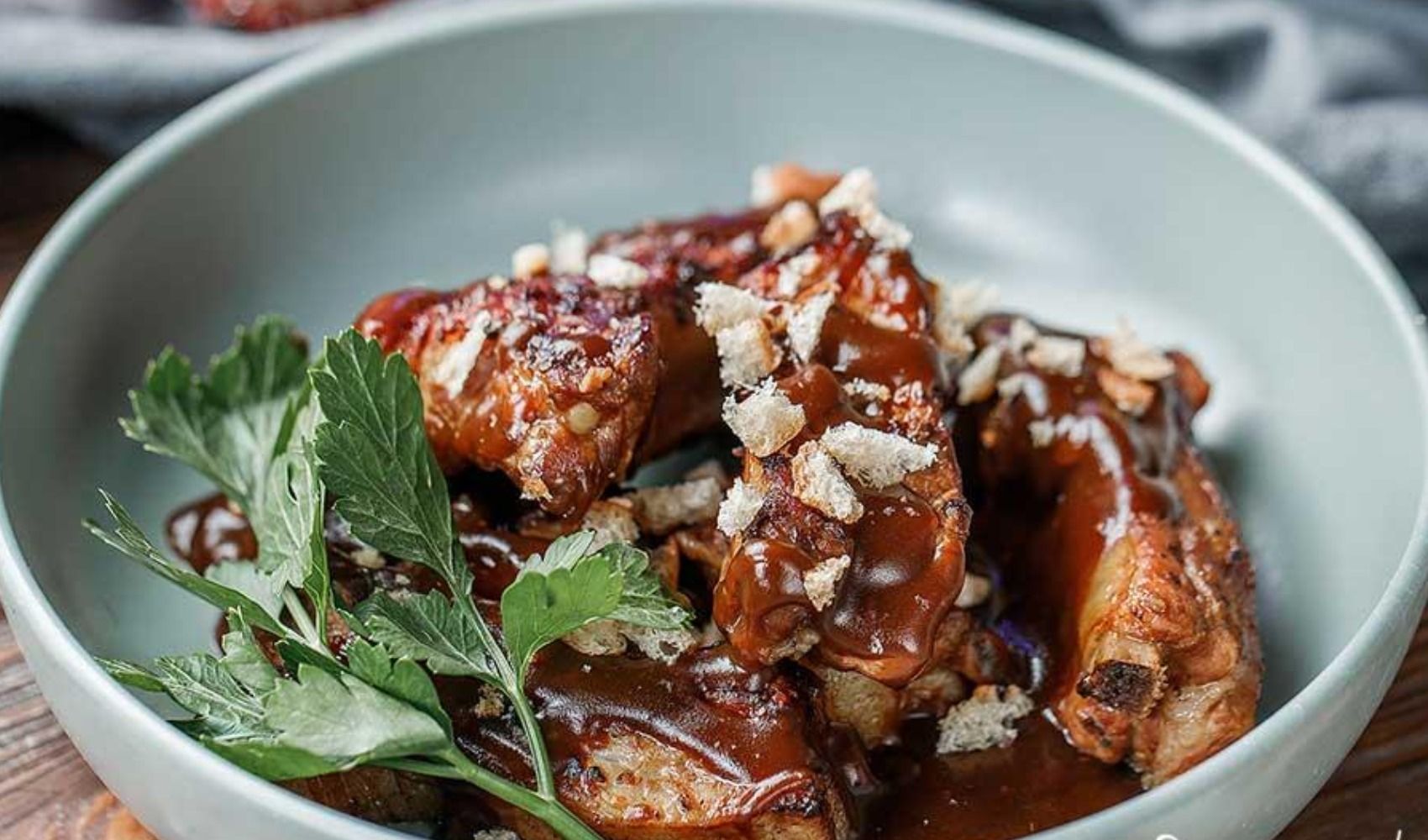 - Понемногу добавляйте смесь в сотейник, перемешивая венчиком, чтобы соус оставался однородным и без комочков. При подаче еще теплые ребра полейте обильно соусом и присыпьте сухарями (1 ст. л.). По желанию добавьте листочки 2-3 веточек петрушки.