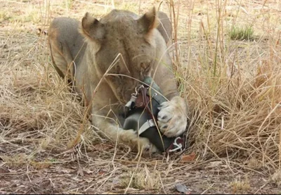 В Африке львы украли у туристки сумку за 1800 долларов и превратили ее в игрушку