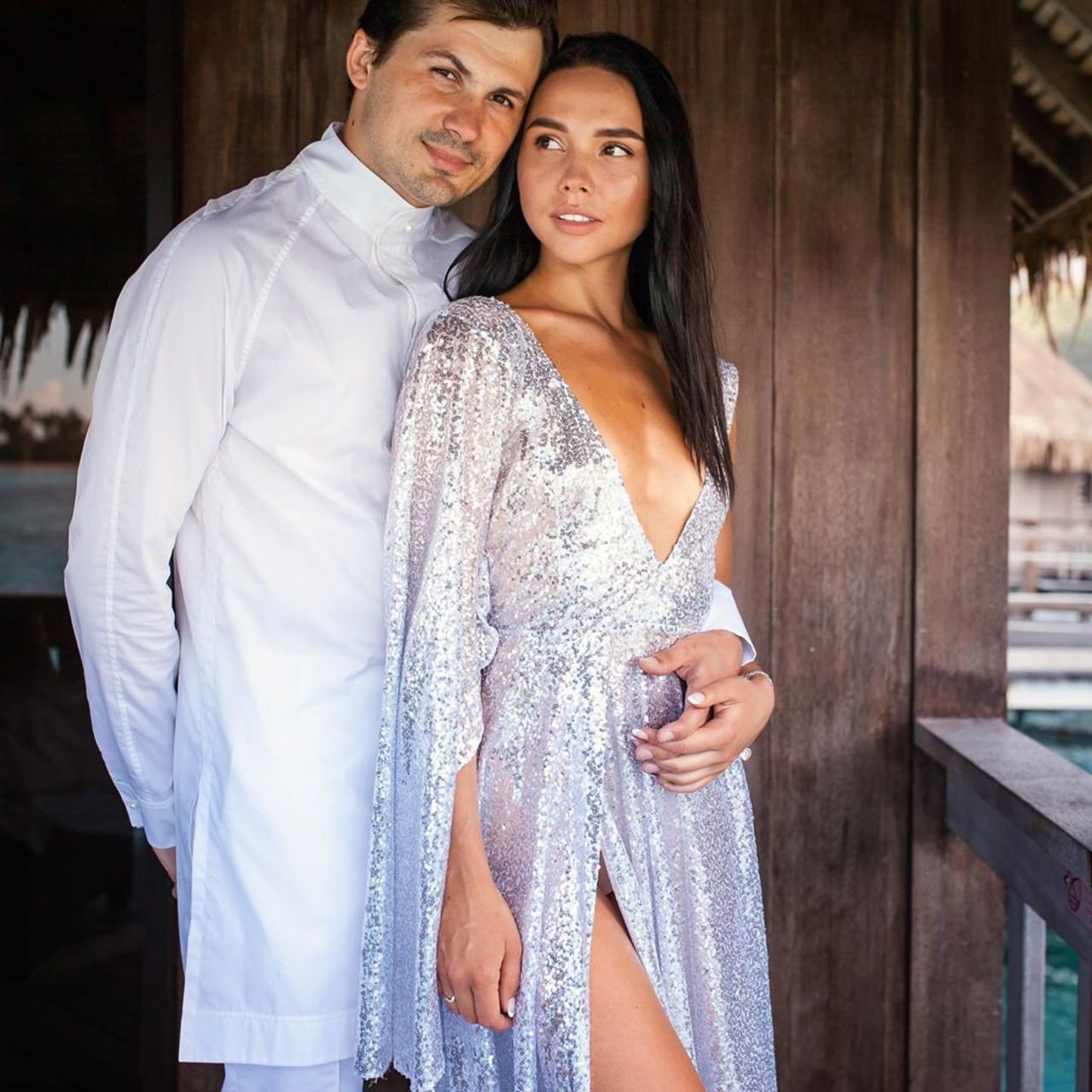 На днях звезда "Танцев со звездами" поделился в сети несколькими новыми фото и видео райского празднования. Для церемонии Женя надел белый костюм, а Наталья выбрала серебристое соблазнительное платье. Дополнили свои свадебные образы влюбленные венками на голове и гавайским ожерельем на шее.