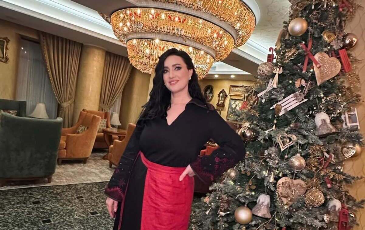 Так, Соломія позує у довгій чорній сукні-вишиванці вільного крою з виразною бордово-червоною вишивкою на рукавах і комірі. Лук телеведуча доповнила стилізованою червоною плахтою з тонким поясом, а замість класичного святкового взуття обрала світло-коричневі замшеві чоботи на підборах. Образ доповнила м’якими локонами та макіяжем з акцентом на очі.