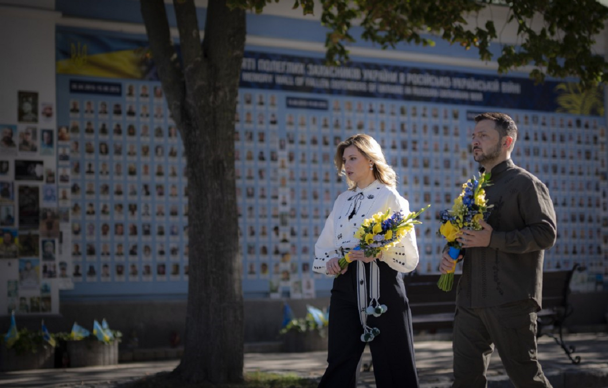 У День Незалежності України президент Володимир Зеленський та перша леді Олена Зеленська вшанували пам'ять полеглих героїв і героїнь України, поклавши квіти в синьо-жовтих кольорах до Стіни пам'яті.