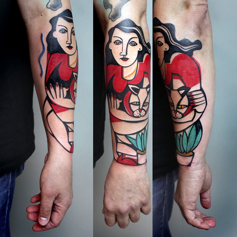 Тату-мастер из Берлина Питер Аурисш выбрал для себя необычный жанр для работы. Парень работает в стиле кубизма, что четко выделяет его работы от остальных мастеров. Автор вдохновляется картинами Густава Климта, Эгона Шиле и Пабло Пикассо.
