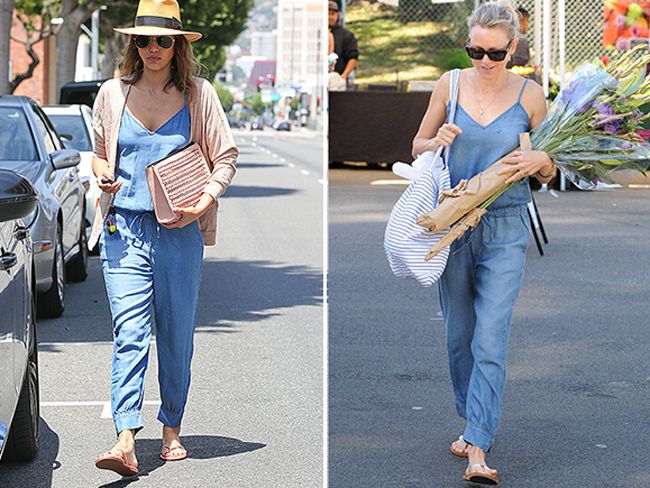Что может быть удобней для прогулки или шопинга, чем джинсовый комбинезон. Звезды это знают и даже выбирают одинаковые наряды. В стильном комбинезоне были замечены Джессика Альба и Наоми Уоттс. Альба добавила в свой образ шляпку и свитер, а Наоми позировала фотографам с цветами.