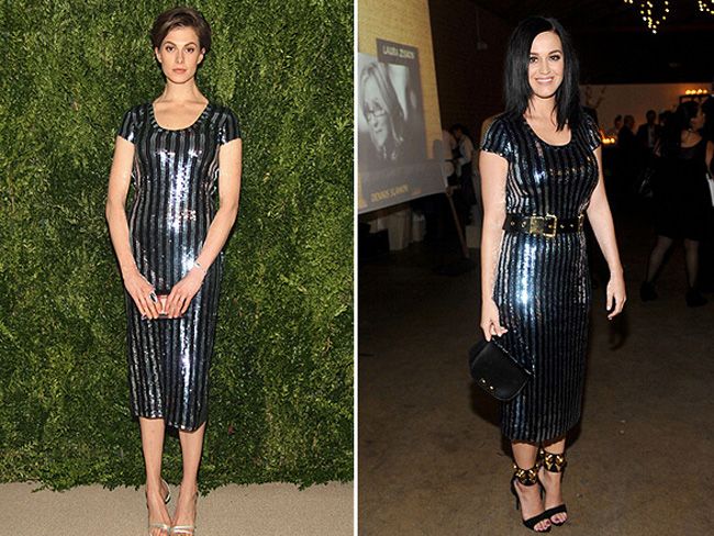 В одинаковых платьях от Marc Jacobs выбрались на люди Элеттра Росселини и Кэти Перри. Кэтти дополнила свой образ ремнем и босоножками с золотом. Элеттра выбрала образ попроще.